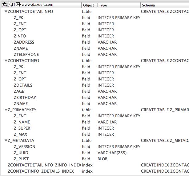 存儲的SQLite數據庫表名稱:大寫“Z”加上實體名稱大寫,一個實體相當於一張表