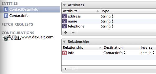 #import <Foundation/Foundation.h> #import <CoreData/CoreData.h> @class ContactInfo; @interface ContactDetailInfo : NSManagedObject @property (nonatomic, retain) NSString * address; @property (nonatomic, retain) NSString * name; @property (nonatomic, retain) NSString * telephone; @property (nonatomic, retain) ContactInfo *info; @end