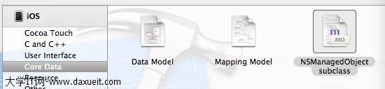 選則file菜單,點擊new,點擊file...,選擇Core Data項,選擇NSManagedObject subclass,生成該實體同名的類,
