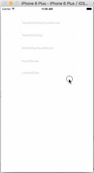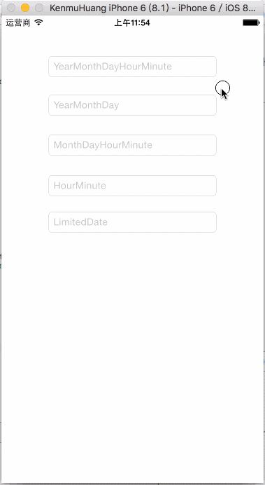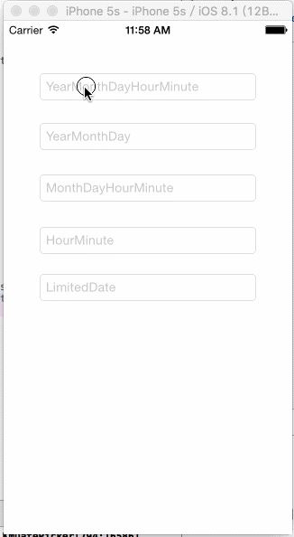 #import <UIKit/UIKit.h> #import "KMDatePicker.h" @interface ViewController : UIViewController <UITextFieldDelegate, KMDatePickerDelegate> @property (strong, nonatomic) UITextField *txtFCurrent; @property (strong, nonatomic) IBOutlet UITextField *txtFYearMonthDayHourMinute; @property (strong, nonatomic) IBOutlet UITextField *txtFMonthDayHourMinute; @property (strong, nonatomic) IBOutlet UITextField *txtFYearMonthDay; @property (strong, nonatomic) IBOutlet UITextField *txtFHourMinute; @property (strong, nonatomic) IBOutlet UITextField *txtFLimitedDate; @end