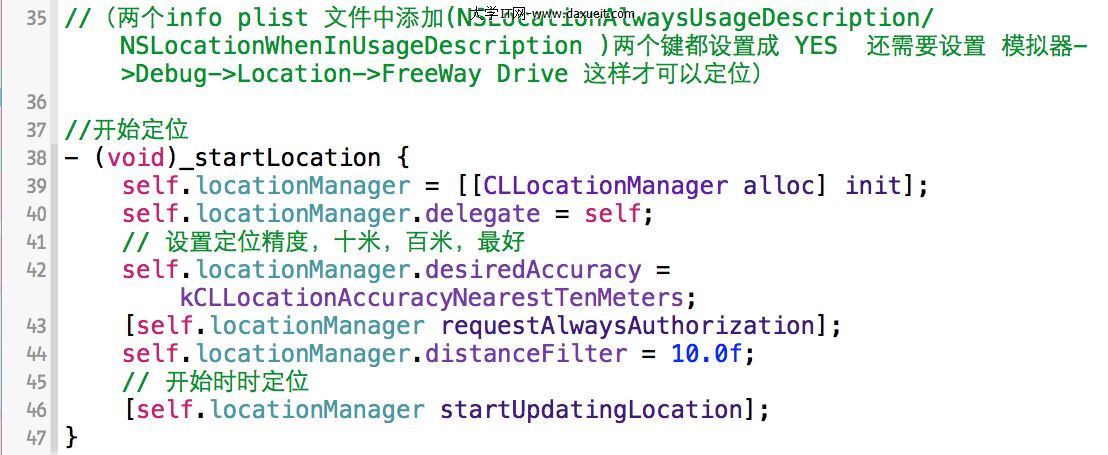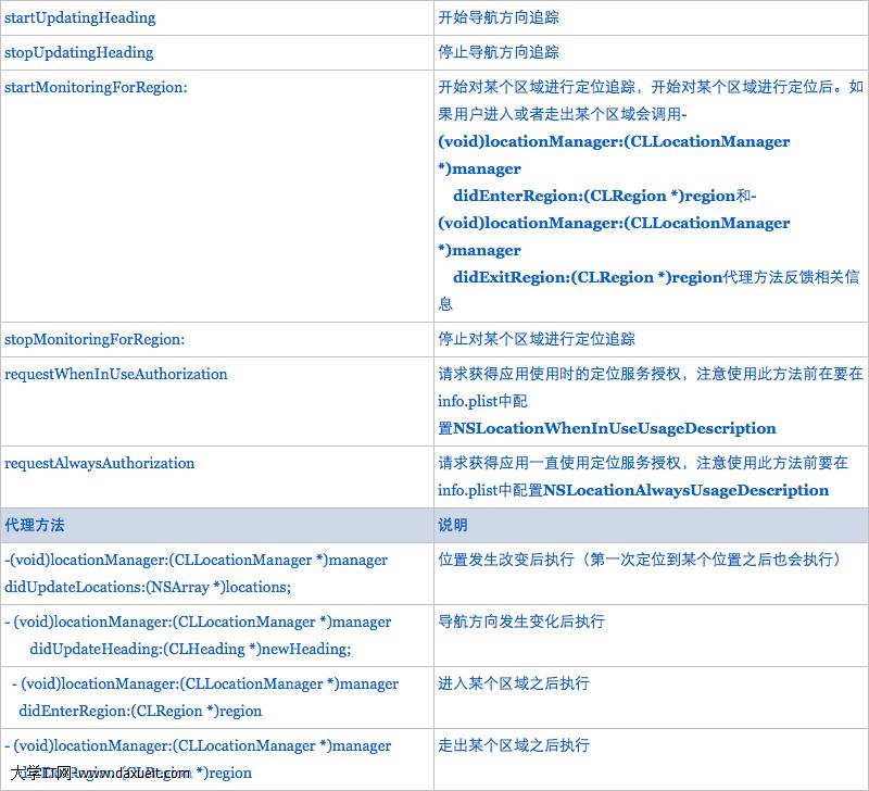 定位是一個很常用的功能,如一些地圖軟件打開之後如果用戶允許軟件定位的話,那麼打開軟件後就會自動鎖定到當前位置,如果用戶手機移動那麼當前位置也會跟隨著變化。要實現這個功能需要使用Core Loaction中CLLocationManager類。首先看一下這個類的一些主要方法和屬性: