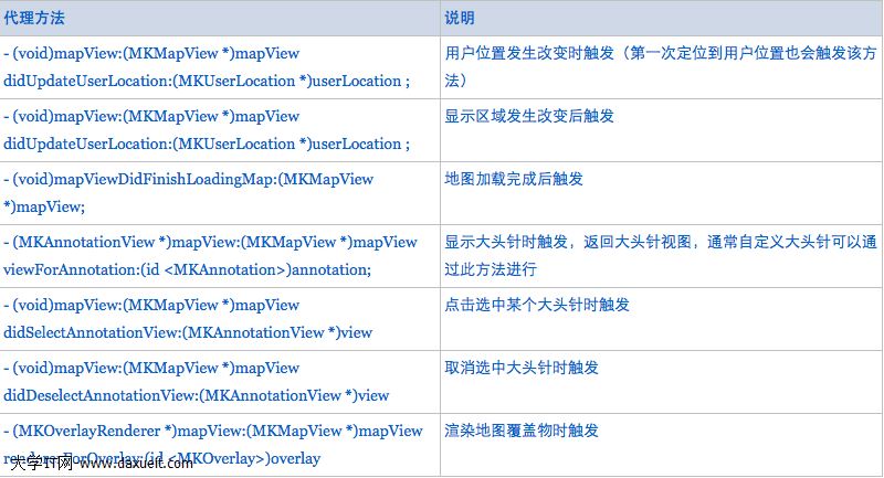 用MapKit之前需要簡單了解一下MapKit中地圖展示控件MKMapView的的一些常用屬性和方法,具體如下表: