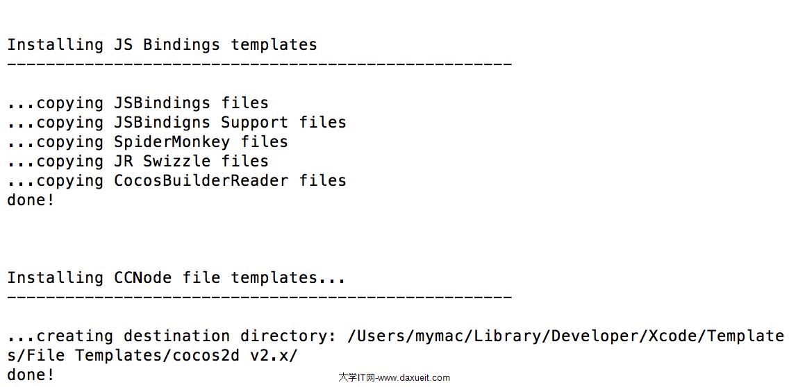 如果能在終端中看到如下圖的內容,說明安裝完成。就可以打開XCode新建項目時看到cocos2d的模板了。