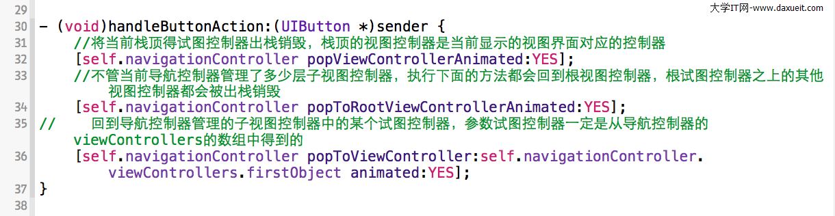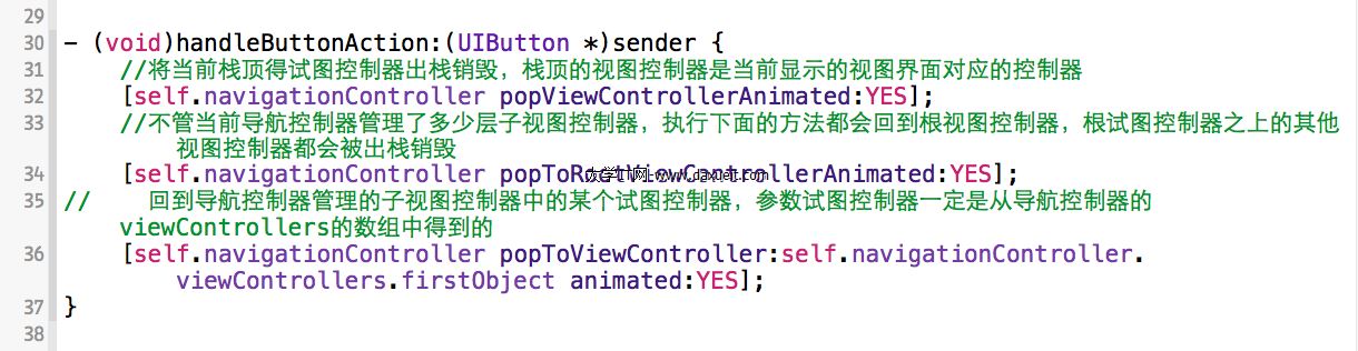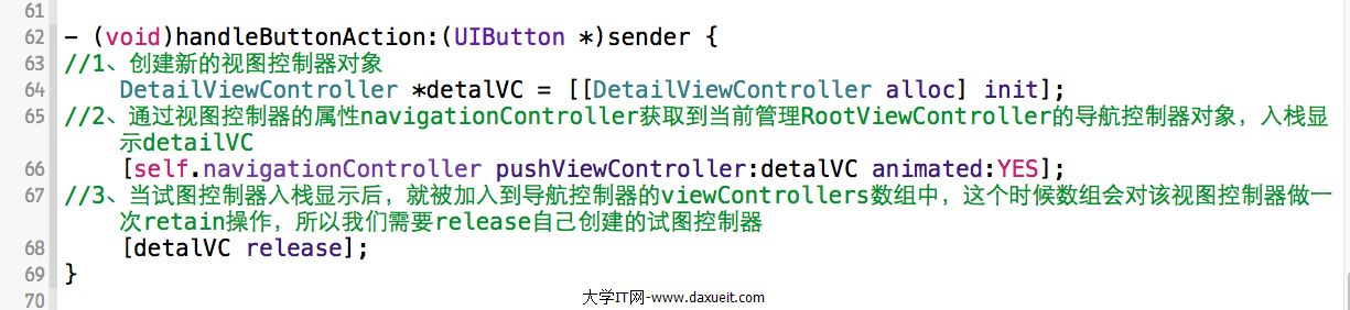 當我們進入DetailViewController時,同樣可以通過點擊詳情試圖上的按鈕在button的響應方法裡來實現視圖間的切換