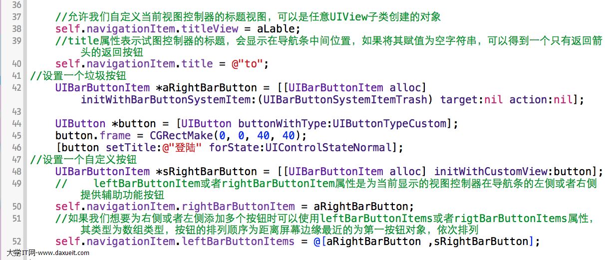 每個視圖控制器都有一個navigationItem屬性,navigationItem中設置的做按鈕、右按鈕、標題等,會隨著控制器的顯示,也顯示到navigationBar上