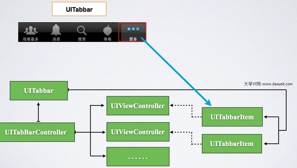 那在上標簽欄的圖裡面,下面的五個button是什麼呢?它們就是標簽欄(UITabBar)的標簽項items(UITabBarItem)。就如導航欄控制器(UINavigationController)上有一個導航欄(UINavigationBar),導航欄上又有一個導航項(UINavigationItem)一樣。