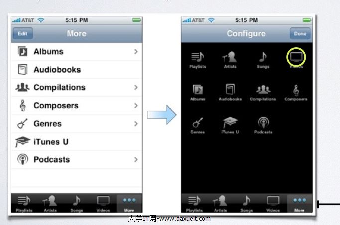 注意:TabBar只能最多顯示五個tabBarItem。如果超過5個則會自動生成個More的標簽顯示剩余的TabBarItem, 這些TabBarItem可以通過編輯顯示在UITabBar上。