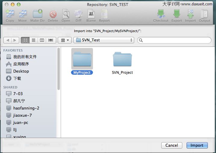 1、創建Svn服務工作路徑同時新建我們的App工程,入下圖所示,SVN_Project是SVN服務的工作路徑,MyProject是我們的iOS工程