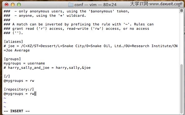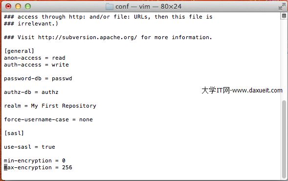 (4)配置svnserve.conf文件,把帶一個#的臨時注釋去掉即可: