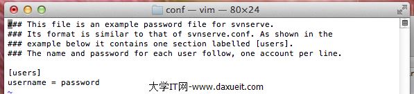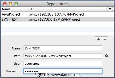 1.想把我們的工程導入svn的話,需要用到一個工具svnx,svnx連接svn服務器,後面跟的文件是SVN的管理文件,用戶名和密碼就是在配置文件中添加的用戶名和密碼