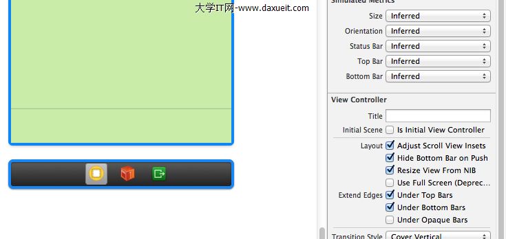 4.在各個視圖間切換的時候下面的Tab Bar是存在的,或減少我們的可視空間,那麼我們應如何隱藏掉呢?在我們的storyboard中只需要把Hide Bottom Bar on push選中即可,選中之後我們切換到該頁面時,就不會顯示Tab Bar了,如下圖所示。
