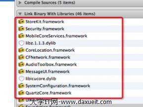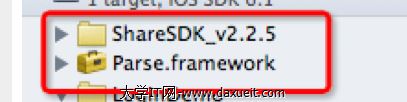 選中工程項目進入“Build Phases”在“Link Binary With Libraries”中點擊“+”號,按照ShareSDK的集成文檔與Parse的文檔說明把需要引入的庫加入到項目中