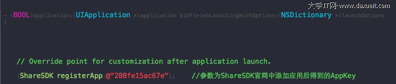 [ShareSDK registerApp:@"288fe15ac67e"]; //參數為ShareSDK官網中添加應用後得到的AppKey