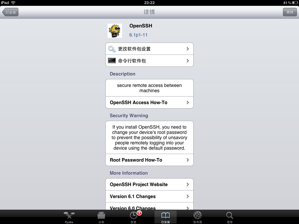 3,安裝並啟動sshd後,通過ssh -l root IPAD_IP_ADDRESS登錄,默認口令是:alpine,這是ios系統默認的root密碼,記得及時修改。