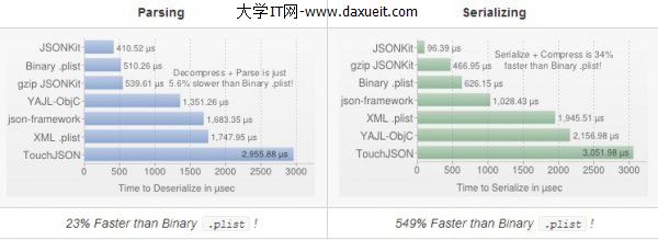 - JSONKit的性能遠優於JSON-Framework(即SBJSON),JSONKit使用起來也非常簡單,表現性能比蘋果iOS 5.0中的NSJSONSerialization還要好,速度比NSJSONSerialization快上25% to 40%,已經是非常大的一個差距了