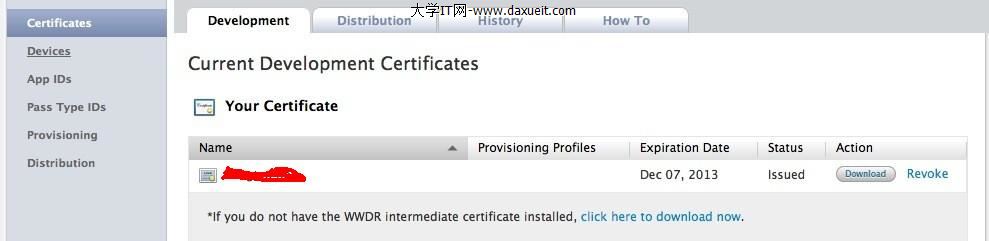 1、用你付過費的帳號登錄到iOSProvisioningPortal,並創建Certificates(已創建可省略),如下圖: