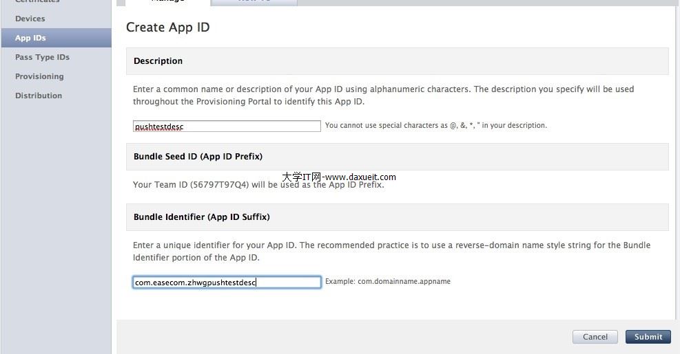 輸入Description,Bundle Identifier,點擊Submit,新建App ID完畢。