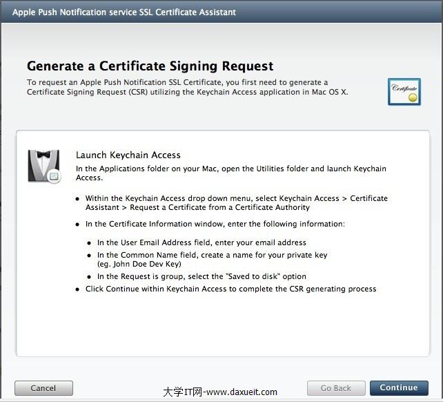 無論是iPhone客戶端跟APNS,還是Provider和APNS都需要通過證書進行連接的。下面介紹一下所用到證書的制作。