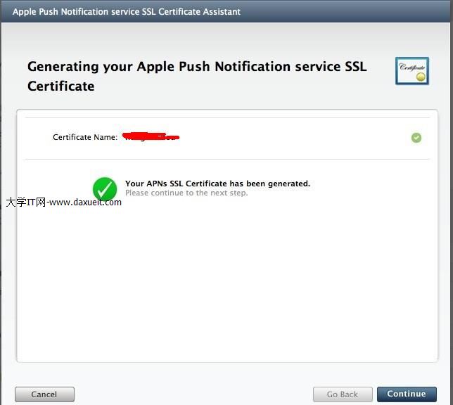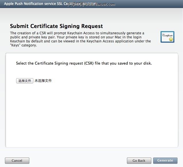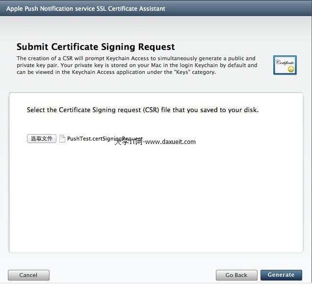 選擇前面生成好的PushTest.certSigningRequest文件,點擊Generate,出現如下所示的頁面: