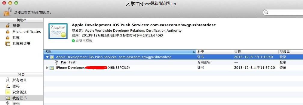 雙擊aps_development-6.cer注冊到你的鑰匙串中,這樣你的鑰匙串中就會有