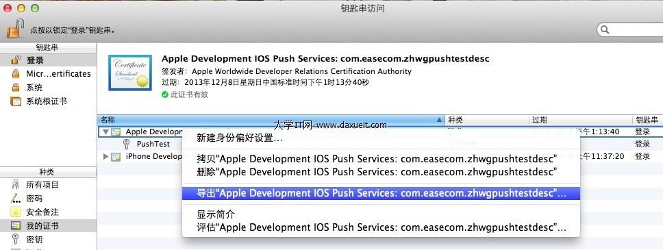 選中Apple Development IOS Push Services:com.easecom.zhwgpushtestdesc,右鍵將其導出。