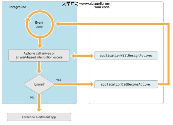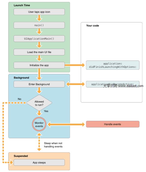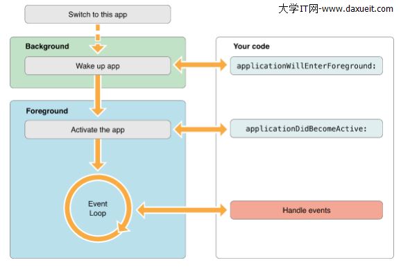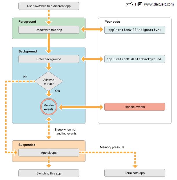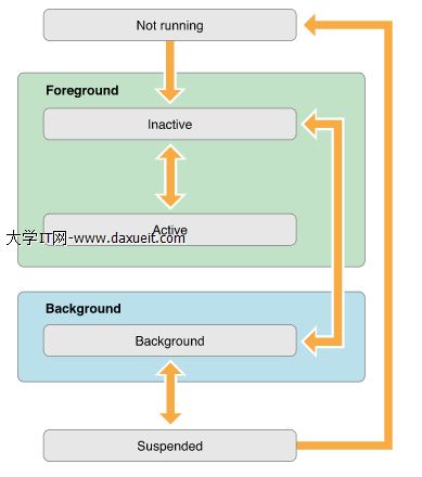 當app處於掛起狀態時,它是不能執行任何代碼的。因此它不能處理在掛起期間發過來的通知,比如方向改變,時間改變,設置的改變還有其他影響程序展現的或狀態的通知。在程序返回後台或前台是,程序都要正確的處理這些通知。