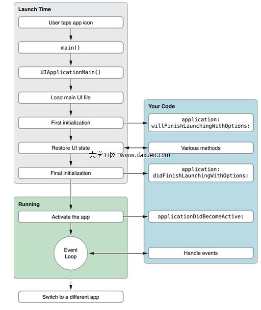 - (BOOL)application:(UIApplication *)application willFinishLaunchingWithOptions:(NSDictionary *)launchOptions 告訴代理進程啟動但還沒進入狀態保存 - (BOOL)application:(UIApplication *)application didFinishLaunchingWithOptions:(NSDictionary *)launchOptions 告訴代理啟動基本完成程序准備開始運行 - (void)applicationWillResignActive:(UIApplication *)application 當應用程序將要入非活動狀態執行,在此期間,應用程序不接收消息或事件,比如來電話了 - (void)applicationDidBecomeActive:(UIApplication *)application 當應用程序入活動狀態執行,這個剛好跟上面那個方法相反 - (void)applicationDidEnterBackground:(UIApplication *)application 當程序被推送到後台的時候調用。所以要設置後台繼續運行,則在這個函數裡面設置即可 - (void)applicationWillEnterForeground:(UIApplication *)application 當程序從後台將要重新回到前台時候調用,這個剛好跟上面的那個方法相反。 - (void)applicationWillTerminate:(UIApplication *)application 當程序將要退出是被調用,通常是用來保存數據和一些退出前的清理工作。這個需要要設置UIApplicationExitsOnSuspend的鍵值。 - (void)applicationDidFinishLaunching:(UIApplication*)application 當程序載入後執行