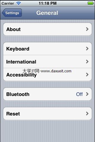 再多說一些關於Navigation Controller,Navigation Controller相信大家都見到過,打開你的iphone,在設置(Settings)裡,選擇通用(General),最最上面的就是Navigation Controller,它的左邊是一個按鈕(稱之為Navigation Button),點擊按鈕切換到前一個view,中間有一個title,顯示當前view的title,Navigation Controller的下面就是一個Table View。