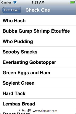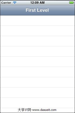 self.title=@"First Level";//對title進行賦值,navigator controller會很聰明的知道當前顯示的table view的title是什麼,並把這個title顯示在自己的上面(剛才上面運行的畫面,navigator controller上面是空的,什麼都沒有,這個是因為剛才還沒有實現BIDFirstLevelController,現在如果再運行程序,你會發現navigator controller上面會顯示“First Level”)。