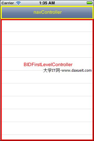 簡單的總結一下上面3句話的含義,就是程序啟動後在iphone的window中首先顯示navController的view,然後在navController的view中顯示BIDFirstLevelController。Navigator Controller的view有2部分組成,最上面的navigator bar和下面的內容view(在這個例子中,下面的內容view我們指定為BIDFirstLevelController)