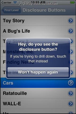 在navigator中顯示了當前table view的title(整個title是在BIDFirstLevelController的viewDidLoad中設定的),navigator左邊的按鈕上顯示了上一層table view的title,表示點擊這個按鈕可以返回到哪一個table view。點擊table view中任意一個cell(不要點最右邊的圓圈箭頭按鈕,否則會切換到再下一層的table view),一個警告框彈出
