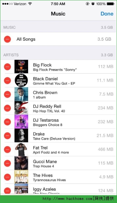 盡管在之前iOS的版本中可以讓你在音樂應用中按照藝術家,專輯和單首歌曲來進行刪除,但你是無法看到每個藝術家或者專輯占據了多少儲存空間的。而在最新的iOS 8系統中,你可以通過前往設置>通用>用量>管理儲存空間>音樂來進行查看。