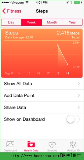 計步器的追蹤功能可精確運行。健康應用允許用戶按天、星期、月和年來對數據進行歸類,而且用戶還可從這個應用中刪除特定組別的Steps追蹤數據。另外,改進後的健康應用還將支持與來自於蘋果App Store的其他應用之間的步數數據共享。