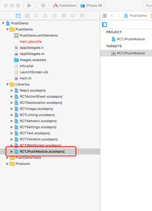 這個步驟,其實是吧 jpush plugin 工程添加到 自己的項目工程裡面,可以看到 Libraries 目錄多了一個 RCTJPushModule.xcodeproj 工程文件,如下圖所示