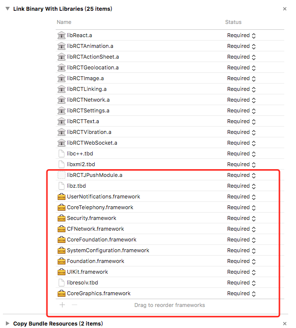 TARGETS -> Build phases -> Link Binary With Libraries 多了幾個系統庫,如下圖所示