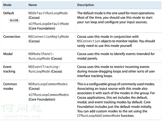 run loop 有如下的幾種模式,每種模式都是用來監聽input source、timer source和notifications事件。每次在運行run loop時都需要為run loop指定某種模式: