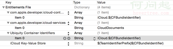-(NSURL *)URLForUbiquityContainerIdentifier:(NSString *)identifier;上面需要傳遞一個雲端存儲容器的唯一標示,這個可以去自動生成的entitlements文件查看Ubiquity Container Identifiers字段獲得,如果傳nil,代表第一個容器