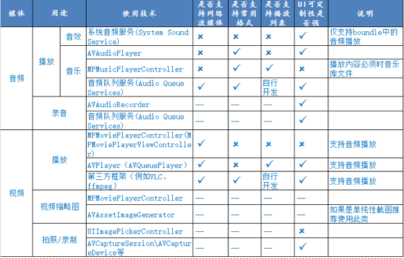 iOS對於多媒體支持相當靈活和完善,具體開發過程到底如何選擇,以上的表格僅供參考。