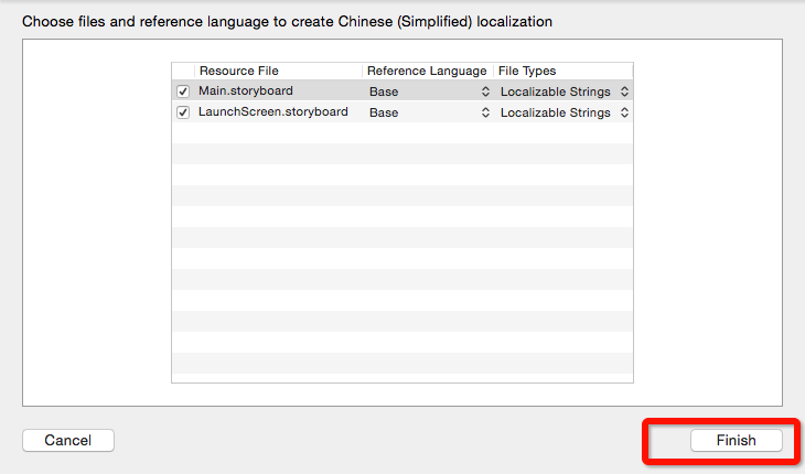 三、點擊上圖中箭頭3指向的框中的+號,會彈出各種語言的選擇,這裡默認已經有一個English的語言,假定我要添加漢語,那就在下拉列表中選擇Chinese(Simplified),點擊之後會彈出如下確定窗口,讓你選擇是否把選擇的語言添加到故事板和啟動畫面的故事板,默認兩個都選擇,我們不做改變,直接Finish。完成之後如右下圖所示。