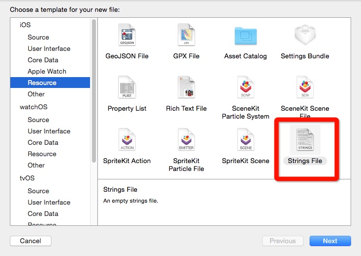 四、完成以上步驟之後,右鍵項目資源樹,右鍵點擊New File,添加一個String File,如下圖所示,文件名為Localizable,注意,必須是Localizable。