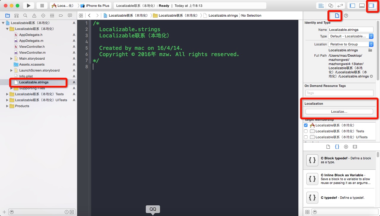 注意在設置按鈕的title時,要用第6行的語句,即NSLocalizedString(@"myBtnTitle", @"這是按鈕myBtn的Title")來代替原來的字符串,這樣我們在後面才可以通過替換myBtnTitle,來設置在不同的語言中按鈕顯示不同的title。