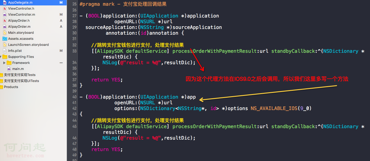 2-9、支付代碼處理之後,我們處理回調結果,我們需要在Appdelegate中添加支付寶頭文件#import <AlipaySDK/AlipaySDK.h>並添加處理回到結果的代理方法: