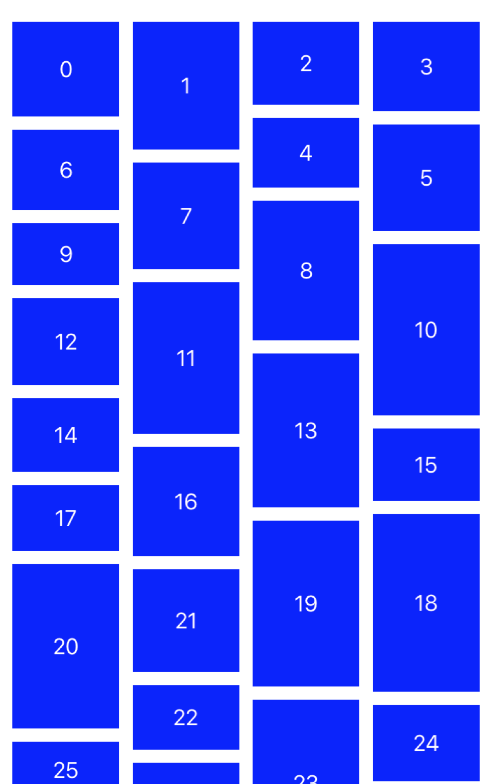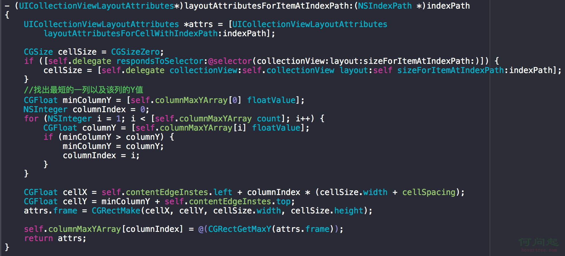 重點是計算布局這裡,第一行Y值都相同,但後續每個cell的高度不同,需要去調整cell的位置,首先找到目前高度最小的那一列(排列第一行時,所有cell的Y值一致,將第一列當做高度最小的一列或者將頂部間距看成是一行高度一致的cell),將cell排列在此列下方,並更新此列的Y值,然後再繼續找高度最小的一列,將cell排列在其下方並更新此列Y值,以此類推,不斷尋找高度最小的那一列,將後續cell排列在其下方並更新這一列的Y值,即可完成布局,當然設置cell布局時還要將cell之間的間隔考慮進去。