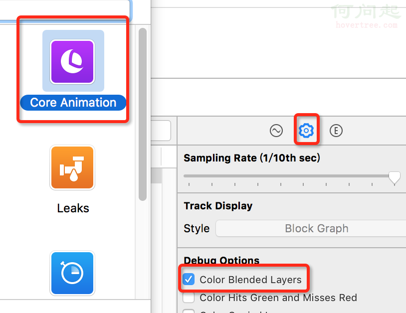 使用Instruments中的Core Animation工具能夠檢測圖層渲染和動畫的相關問題,包括圖層混合問題,即當多個圖層疊加在一起,顏色不同時,處理這樣的顏色混合情況會消耗GPU資源,監測發現這些區域會變紅,其它正常區域為綠色
