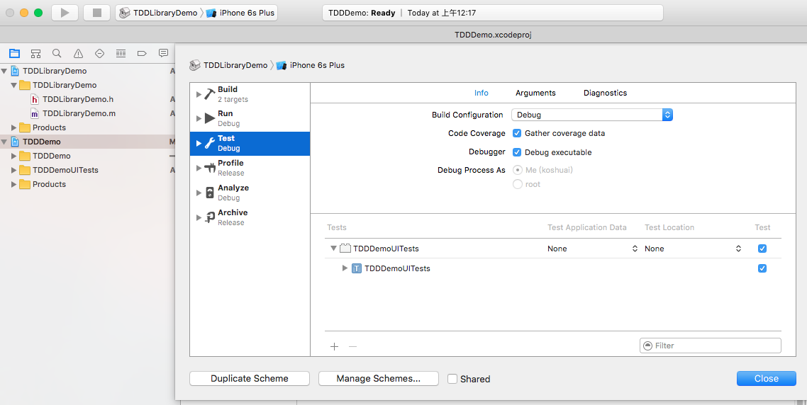 接入APP是不能直接訪問靜態庫工程的文件的,因此接入APP的UI測試得不到靜態庫工程的代碼覆蓋率,如何解決呢?很簡單,雖然靜態包不能單獨運行UI,但可以在靜態庫的Scheme-Test中添加接入APP的測試Target,就可以在靜態庫的project裡用看到UI Testing的用例並執行。測試類也可以直接訪問到靜態庫工程中的文件,並得到代碼覆蓋率結果了。同樣,這裡也需要勾選上 Gather coverage data, 如下圖: