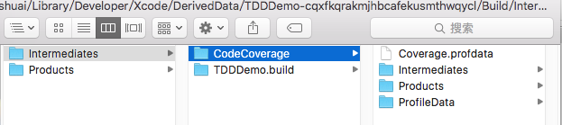 測試結果文件的位置,從工程目錄的生成app,打開finder,往上找Intermediates文件夾就行了。Coverage.profdata就是我們要找的結果文件。