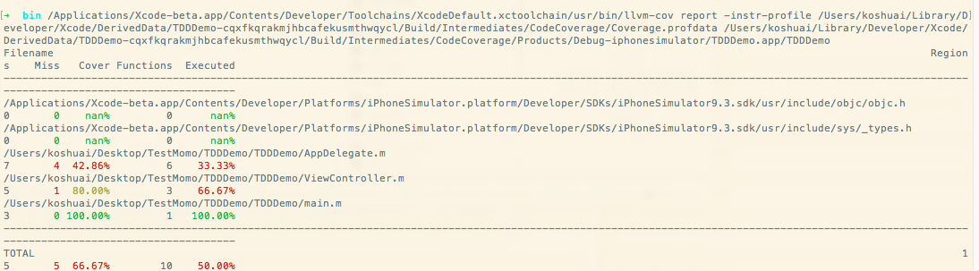 解析文件的命令為xxx/llvmoconv report -instr-profile xxx/Coverage.profdata xxx/xx.app/xx,其中report為參數,可以換成show得到各文件結果。xx.app要取與Coverage.profdata同目錄的Products文件夾內的。
