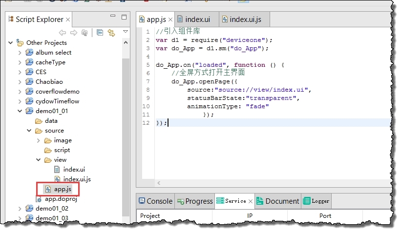 app.js是整個項目的入口腳本環境,雙擊該文件在右側進入編輯。需要注意的是app.js較為特殊,如果要在該文件內使用DeviceOne的組件,需要先require(“DeviceOne”),如第一句代碼所示,而其他.js腳本環境是不需要引用可以直接使用的。在這個腳本環境中我們要做的操作是打開一個新頁面,需要調用的是App組件的openPage方法,openPage總共有八個參數,這裡先簡單介紹用到的其中三個,其他參數的用法詳見App的openPage。這裡整段代碼含義就是先定義一個sm類組件分類介紹的App,在App的loaded事件中打開一個新頁。loaded事件會App啟動完成時觸發,所以我們把打開新頁的打開寫在這裡面。其中openPage方法的source參數表示的是需要打開的頁面的地址(絕對路徑);statusBarState參數表示的是頂部狀態欄顯示狀態,這裡選擇的是transparent,這樣設置能讓打開的index.ui頁在手機上顯示的為全屏效果,即隱藏手機的頂部狀態欄;animationType參數表示的是打開頁面時的過渡動畫類型,這裡選擇fade淡入淡出的方式,這樣就能以淡入淡出的過渡動畫全屏打開到index.ui頁面了。