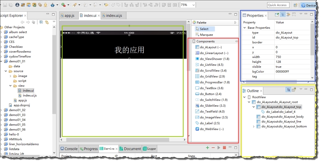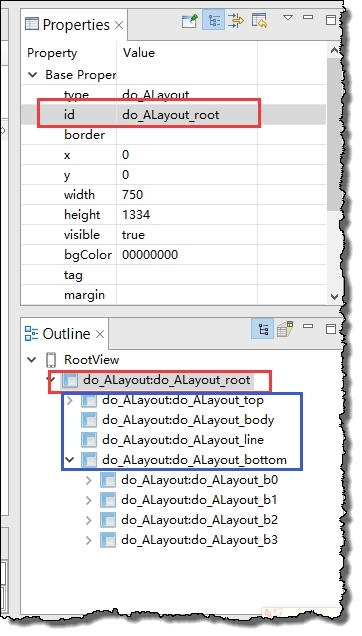 在RootView中只允許有一個容器類組件,其他組件都是放在這個容器類組件中的,通常我們選擇ALayout絕對布局組件來當這個容器組件。我們點擊選中該組件(如上圖紅框所示),通過屬性列表修改該組件的id為do_ALayout_root,默認大小是跟整個項目的大小相同的750x1334,再繼續像該容器內添加四個ALayout,id分別修改成do_ALayout_top、do_ALayout_body、do_ALayout_line和do_ALayout_bottom,它們的id對應了它們的功能分別如頁面布局示意圖中所示的top、body、line和bottom。分別調整著四個ALayout的x、y、width、height屬性,以調整它們在頁面中的位置。再繼續向do_ALayout_bottom容器中添加四個ALayout,id分別改為do_ALayout_b0/b1/b2/b3,