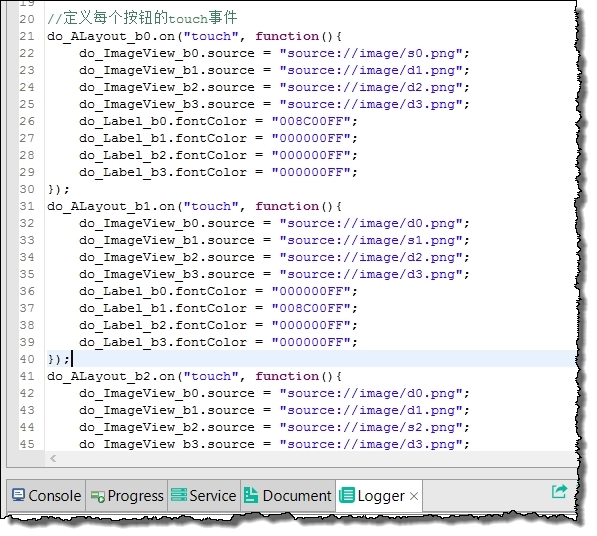 ImageView和ALayout都有點擊事件(touch),為了讓用戶有更好的體驗,我們加大點擊響應范圍,將touch事件訂閱在Bottom的四個ALayout中,並在該事件中通過改變其他ALayout裡Label的文字顏色和ImageView圖片source來達到點擊選中的效果。